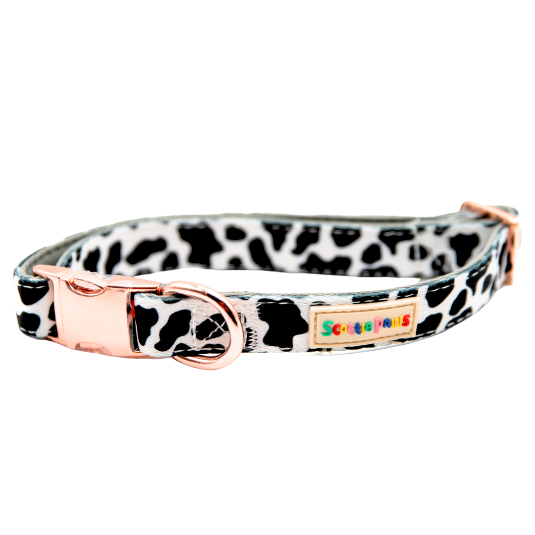 Our stylish, comfy Cow Print dog collar adds a distinctive charm to your dog's accessories. This collar not only serves a practical purpose but also makes a beautiful keepsake, perfect for commemorating special memories or as a gift for fellow dog lovers.
