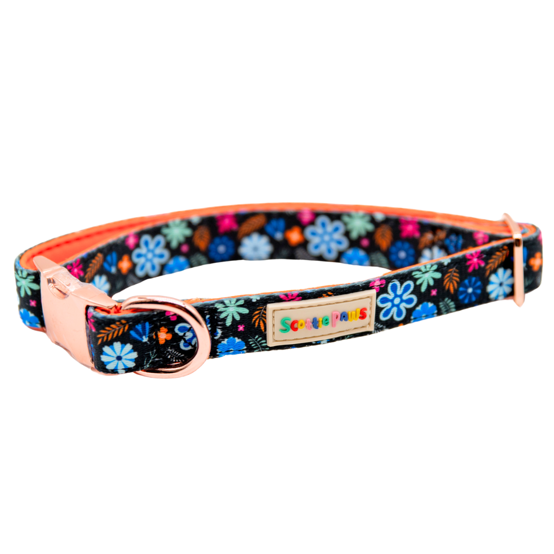 The Midnight Floral designed dog collar adds a distinctive charm to your dog's accessories. This collar not only serves a practical purpose but also makes a beautiful keepsake, perfect for commemorating special memories or as a gift for fellow dog lovers.