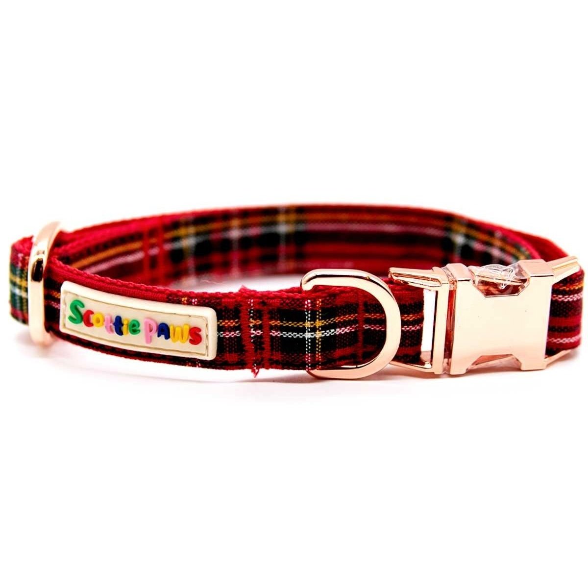 This ruby red dog collar is giving classic with a twist—featuring a bold tartan edge and luxe rose gold hardware to turn heads on every walk. Handmade using a soft, durable material, this adjustable collar is designed for everyday comfort and a secure fit around your dog’s neck. With a sturdy D ring for your dog lead and a smooth slider to ensure the perfect fit, this collar is suitable for pups and grown dogs alike.