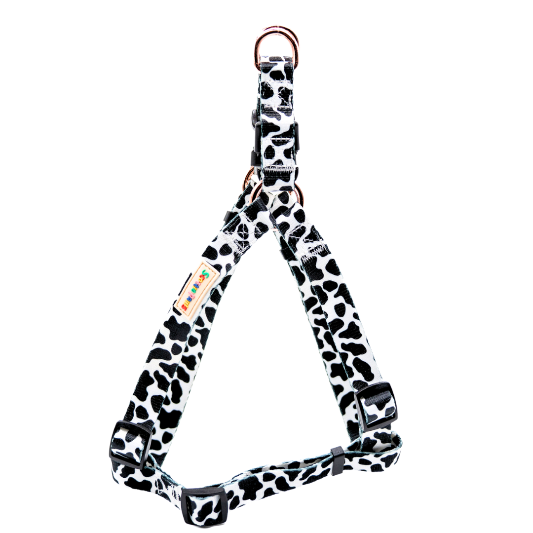 The cow print inspired stepin2 dog harness, featuring a fresh and fun design. Made with high-quality materials and rose gold fastenings it is a stylish and practical choice for creating lasting memories or as a gift for any pet owner.