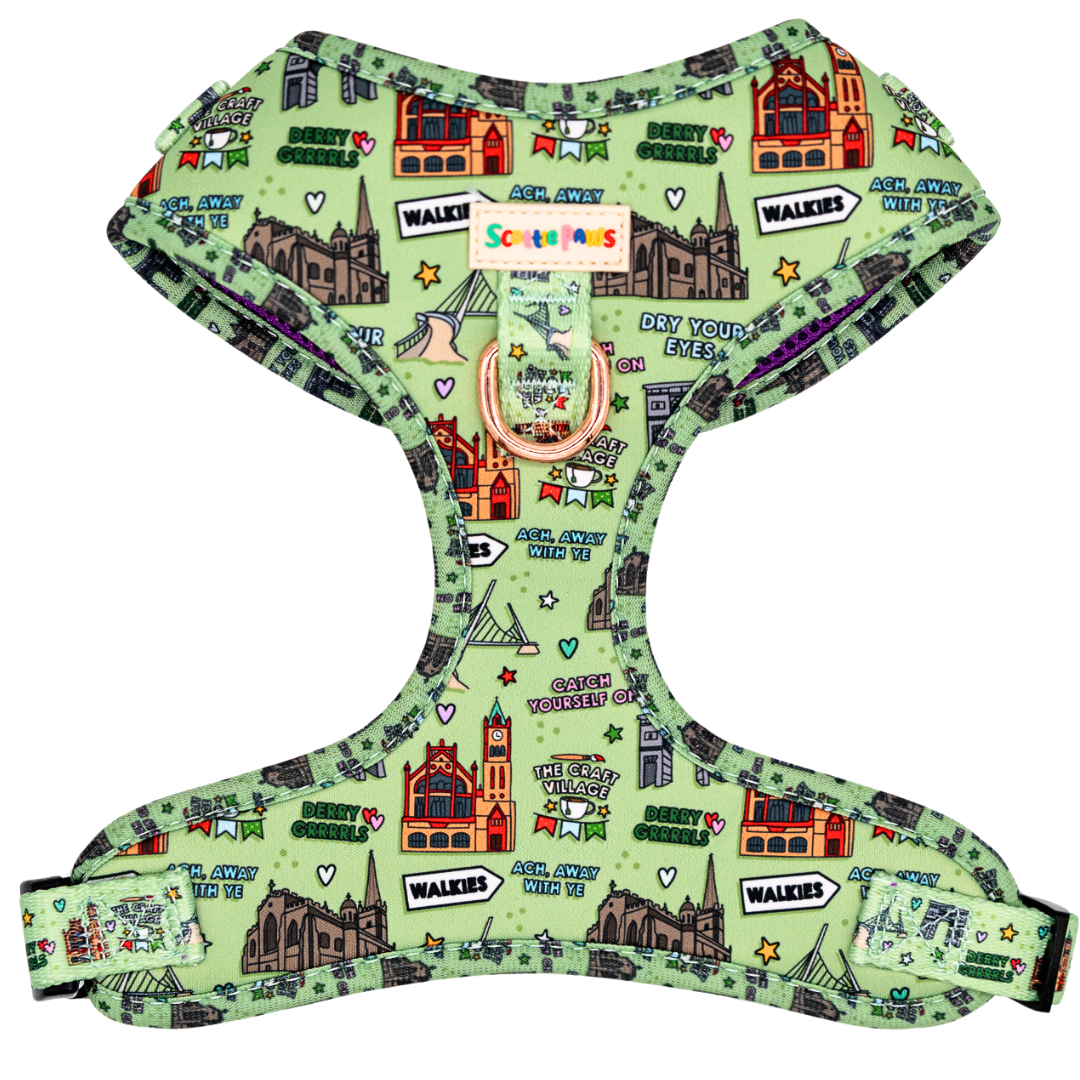 The Derry GRRRL inspired adjustable dog harness, featuring a nod to local heritage and architecture.  Made with high-quality materials and rose gold fastenings it is a stylish and practical choice for creating lasting memories or as a gift for any pet owner.
