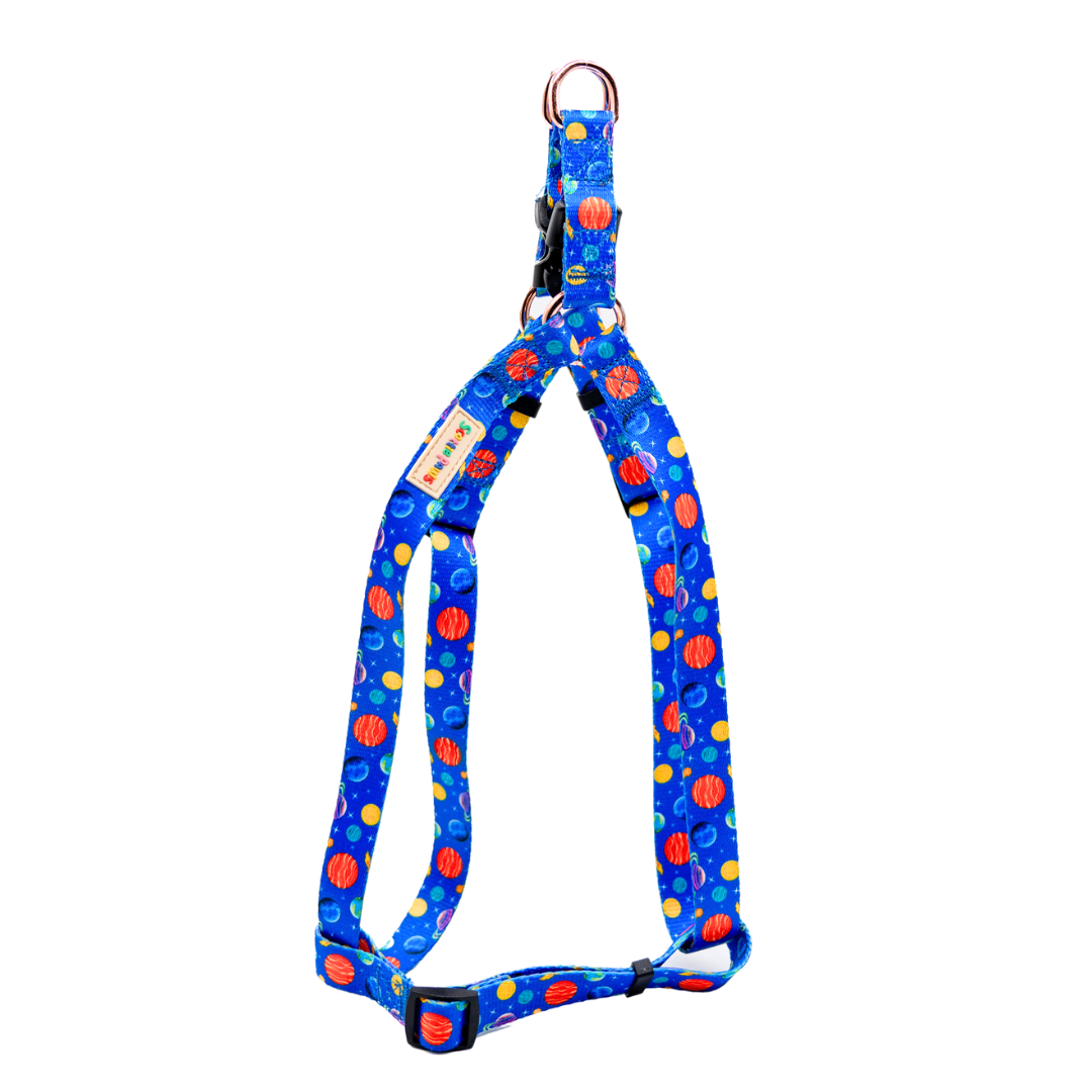 The into space inspired stepin2 dog harness, featuring a fresh and fun design.  Made with high-quality materials and rose gold fastenings it is a stylish and practical choice for creating lasting memories or as a gift for any pet owner.