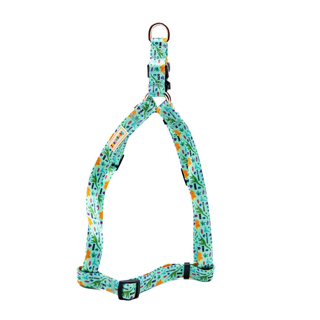 The pre-historic inspired stepin2 dog harness, featuring a fresh and fun design. Made with high-quality materials and rose gold fastenings it is a stylish and practical choice for creating lasting memories or as a gift for any pet owner.